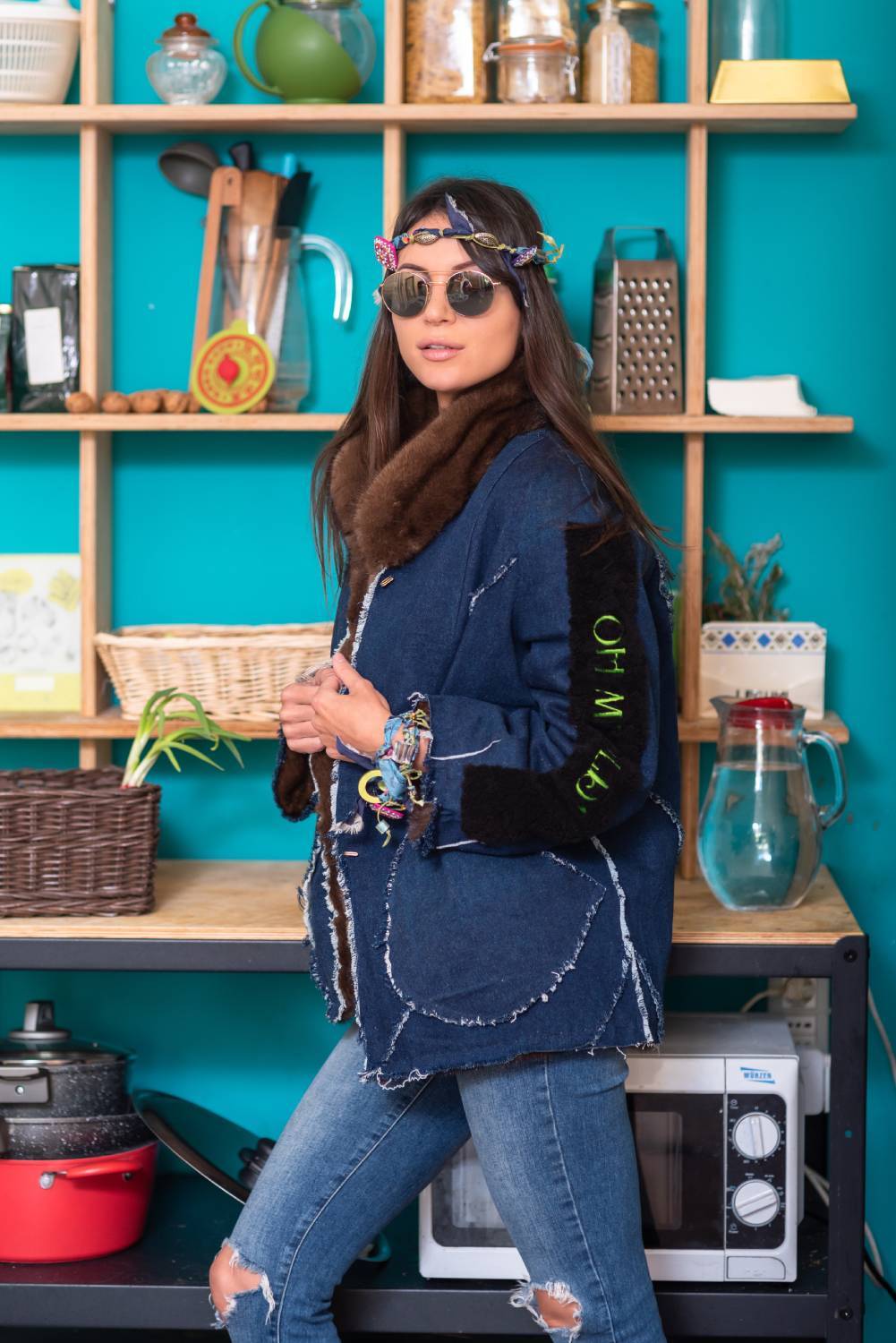 Creazione originale di laboratorio Borello Atelier, giacca denim “Cindy” con interno in pelliccia visone naturale riciclato.