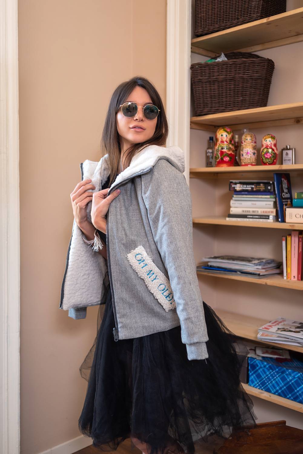 Giacca modello “Bomber” realizzata in pelliccia di visone e pelliccia di volpe riciclata con aggiunta di pelliccia di montone curl naturale e polsi in cashmere. Lavorazione artigianale di laboratorio Borello Atelier.
